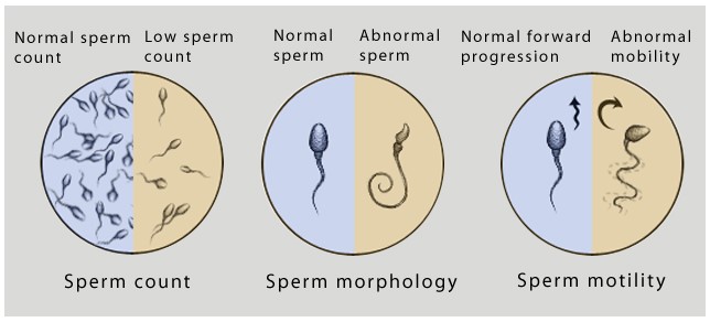Macroscopic parameters that are analyzed in semen samples include volume, color, viscosity and sample appearance and microscopic ones include sperm count, sperm motility, sperm morphology, presence or absence of agglutination and White blood cells.