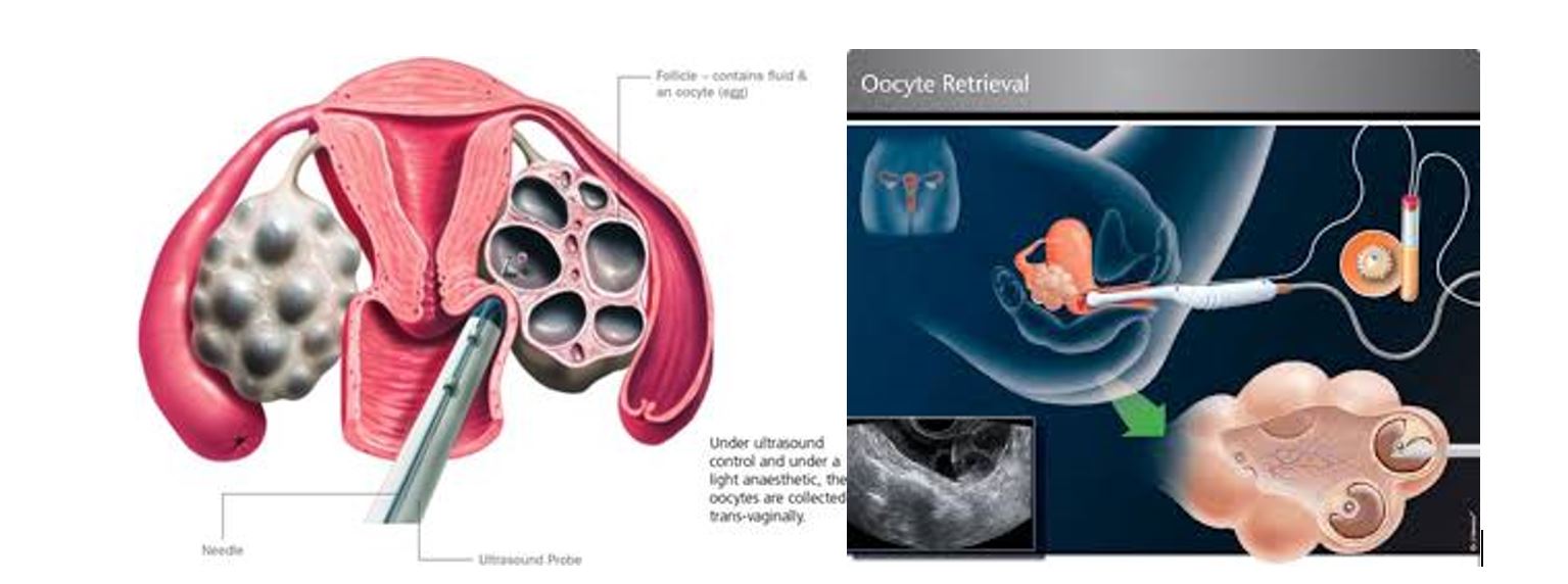 A minor surgery, called follicular aspiration, is done to remove the eggs from the woman’s body. The woman will be given medicines so she does not feel pain during the procedure. Using ultrasound images as a guide, the health care provider inserts a thin needle through the vagina and into the ovary and sacs (follicles) containing the eggs. The needle is connected to a suction device, which pulls the eggs and fluid out of each follicle, one at a time. The procedure is repeated for the other ovary. There may be some cramping after the procedure, but it will go away within a day.